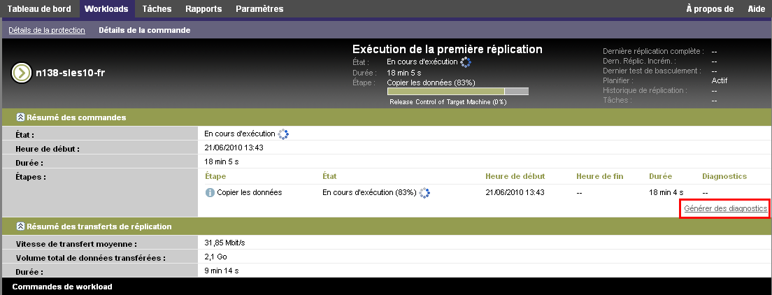 Dans le client Web PlateSpin Forge, après avoir exécuté une commande, vous pouvez générer des rapports de diagnostic détaillés sur les détails de la commande.