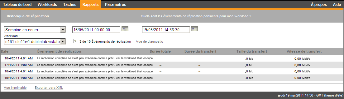 Historique de réplication : reprend le type, la taille et l'heure de réplication ainsi que la vitesse de transfert pour chaque workload, dans une plage de temps sélectionnable.