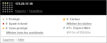Chaque carte comporte des liens hypertexte qui permettent d'accéder aux pages Workloads, Rapports, Paramètres et Tâches de l'instance. D'autres liens hypertexte permettent d'éditer la configuration d'une carte ou de supprimer une carte de l'affichage.