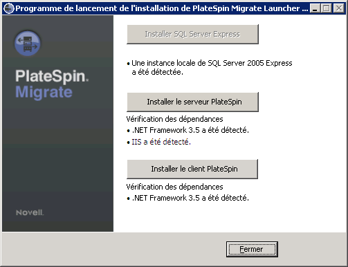 Si vous prévoyez d'utiliser le logiciel Microsoft SQL Server 2005 Express Edition distribué avec PlateSpin Migrate, installez-le d'abord. Si vous prévoyez d'utiliser une base de données SQL Server 2005 existante, ignorez l'installation de la base de données, commencez à installer le serveur PlateSpin Migrate et spécifiez votre base de données existante lorsque vous y êtes invité.
