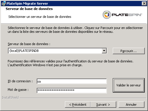Si vous comptez installer et utiliser un serveur de base de données local inclus dans votre distribution de logiciels PlateSpin Migrate (option par défaut), gardez la sélection par défaut (local)\PLATESPINDB dans la liste déroulante et conservez les références sa par défaut. Si, par la suite, vous déplacez votre instance de base de données PlateSpin Migrate ou modifiez votre mot de passe SQL Server, vous devez redéfinir les paramètres de connexion de la base de données PlateSpin Migrate. Reportez-vous à l'article de la base de connaissances n° 7970523.