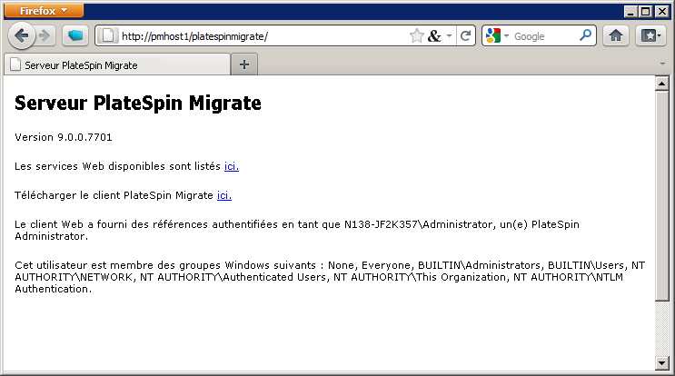 Le navigateur charge la page d'accueil du serveur PlateSpin Migrate :