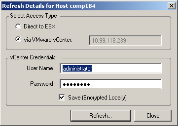 Toutes les communications ultérieures avec les hôtes ESX s'effectuent via le serveur vCenter. Pour redéfinir le mécanisme d'accès sur ou sur , rafraîchissez les détails de l'hôte ESX requis et sélectionnez l'option requise. Reportez-vous à la section Redéfinition du mécanisme utilisé pour l'authentification de l'accès aux hôtes ESX. |