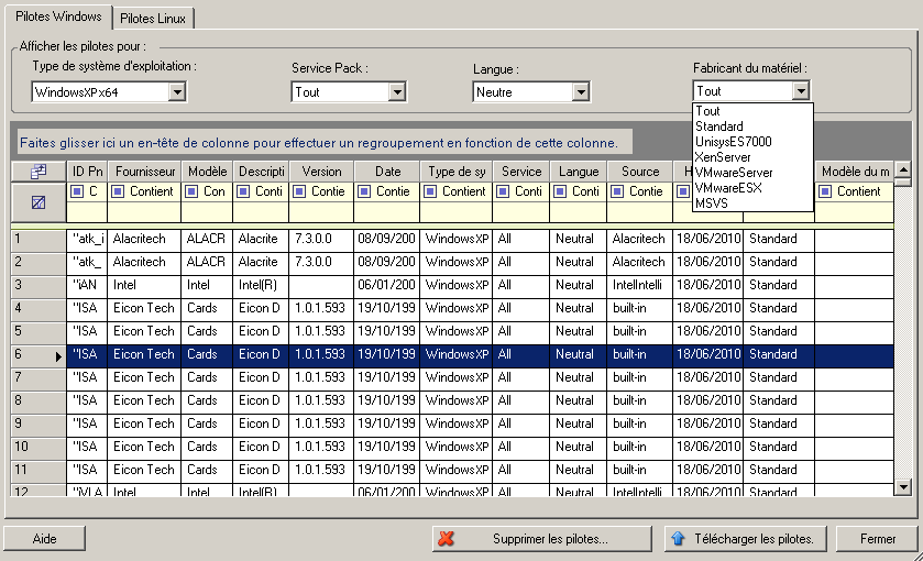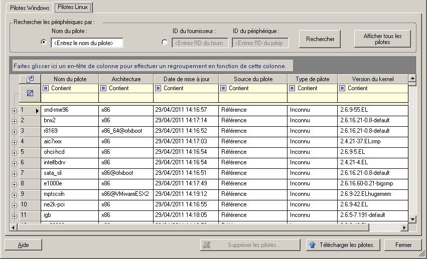 Le gestionnaire de pilotes PlateSpin permet de télécharger les pilotes de périphériques dans la base de données des pilotes.