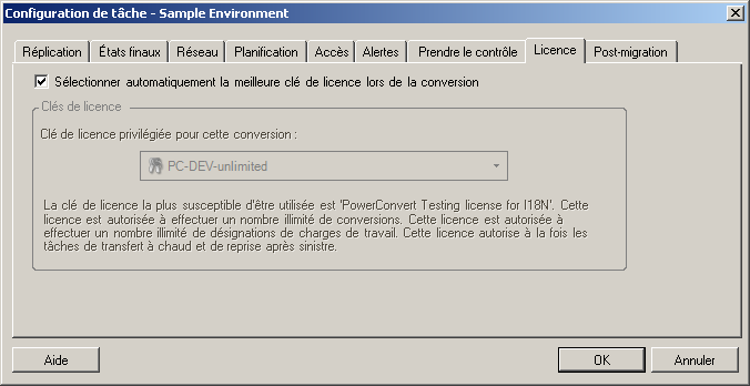 Par défaut, PlateSpin Migrate sélectionne la clé de licence qui convient le mieux pour une tâche de migration particulière. Si vous avez plusieurs clés de licence, vous pouvez sélectionner une clé de licence spécifique à appliquer à une tâche de migration particulière. Pour plus d'informations sur l'acquisition des licences pour le produit et la gestion des clés de licence, reportez-vous à la Section 2.1, Acquisition de licences PlateSpin Migrate.