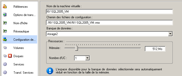 Pour les tâches impliquant la virtualisation de workloads, PlateSpin Migrate propose un mécanisme qui permet de spécifier les options de configuration des machines virtuelles cibles, telles que l'indication du nom d'une machine virtuelle cible et d'un chemin d'accès au fichier de configuration, la sélection d'une banque de données à utiliser et l'allocation de mémoire virtuelle, conformément aux fonctions et capacités de la plate-forme de virtualisation sélectionnée.