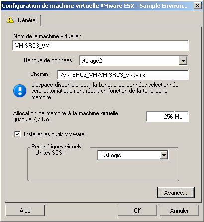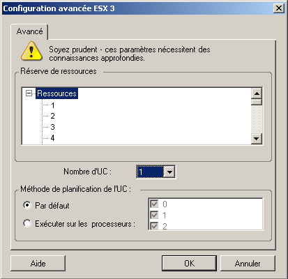 Les options de configuration suivantes sont spécifiques aux systèmes VMware ESX. Pour accéder aux paramètres de contrôle des réserves de ressources, du nombre d'UC et de la méthode de planification de ces dernières, cliquez sur