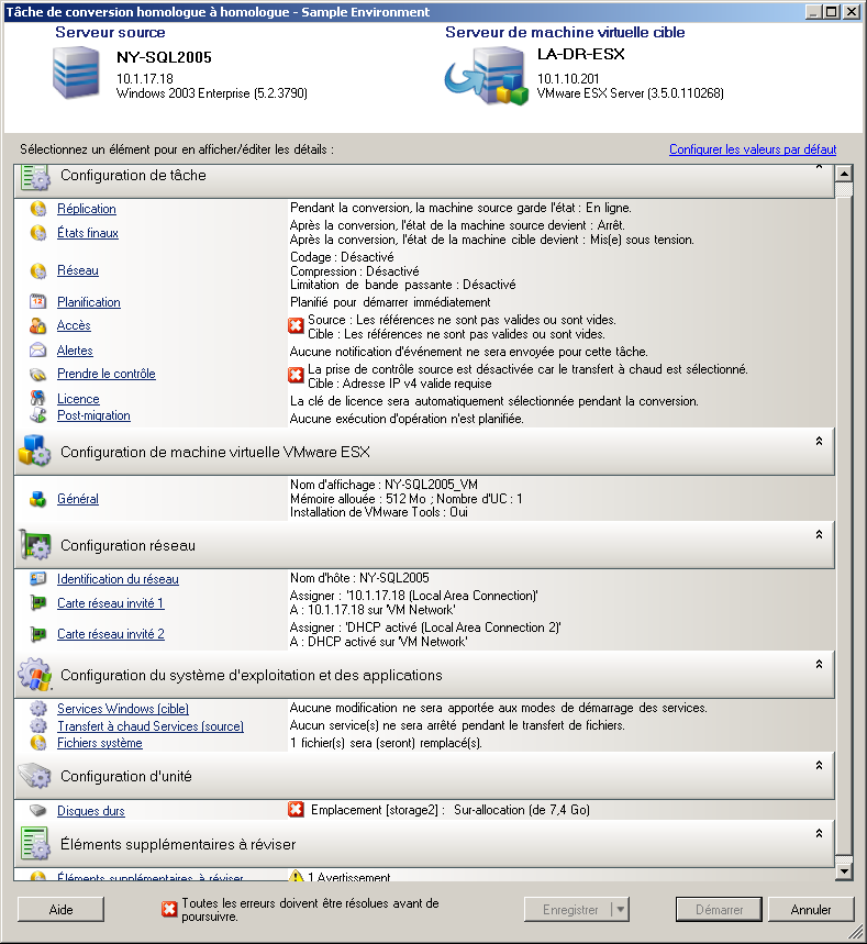 Figure 4-1 Fenêtre Tâche de migration homologue à homologue (P2V en mode Avancé)