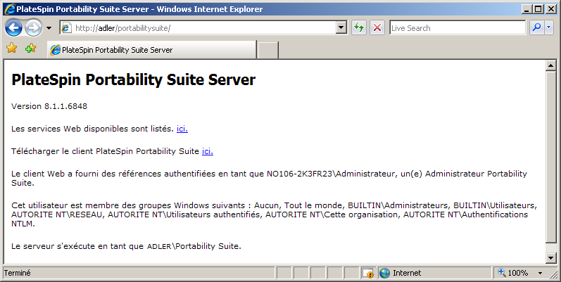 Le navigateur charge la page d'accueil du serveur Portability Suite :