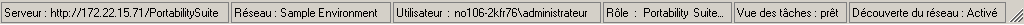 Barre d'état : dans la partie inférieure de la fenêtre du client Portability Suite, la barre d'état affiche le serveur Portability Suite auquel le client est actuellement connecté, le réseau Portability Suite que vous utilisez, le nom et le rôle de l'utilisateur actuellement logué, et l'état de la fonction de découverte automatique du réseau.