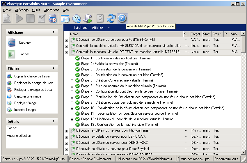 La vue Tâches affiche toutes les tâches de découverte, de conversion et de capture d'image exécutées par le serveur Portability Suite. Les tâches peuvent être filtrées en fonction de leur état actuel.