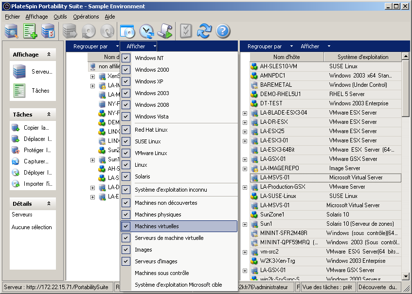 Pour contrôler davantage le nombre d'éléments affichés dans l'un des deux volets de la vue, vous pouvez également utiliser le menu déroulant afin de filtrer les machines par type de charge de travail, tel que Windows NT 4, Windows 2000, Red Hat Linux, etc., comme illustré dans la figure ci-dessous :