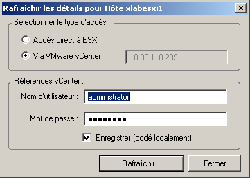 Toutes les communications ultérieures avec les hôtes ESX s'effectuent via le serveur vCenter. Pour redéfinir le mécanisme d'accès sur ou sur , rafraîchissez les détails de l'hôte ESX requis et sélectionnez l'option requise. Reportez-vous à la section Redéfinition du mécanisme d'accès utilisé pour l'authentification de l'accès aux hôtes ESX. |