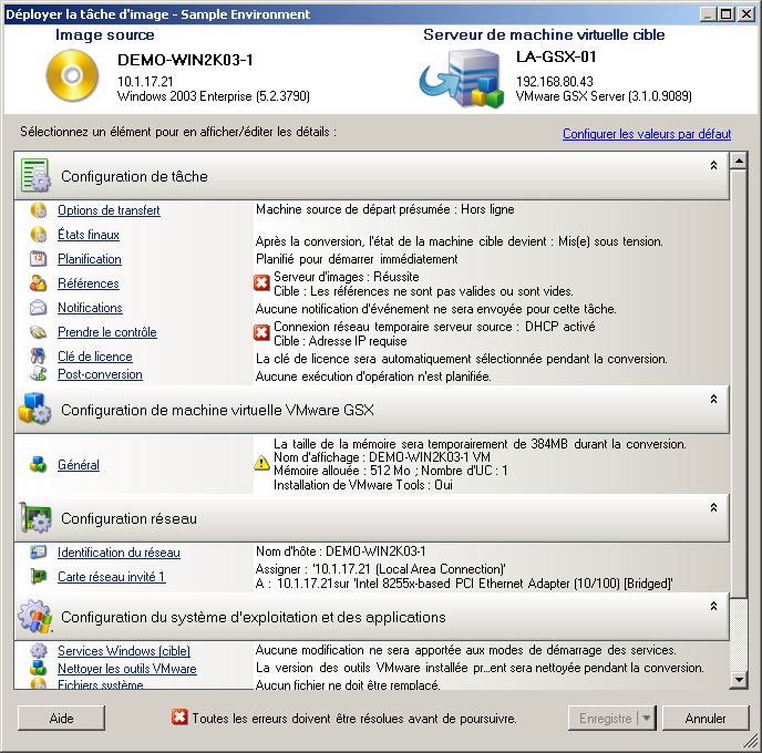 Les tâches de conversion sont configurées automatiquement pour créer la machine cible avec les mêmes paramètres que le serveur source. En fonction des objectifs de la conversion, vous pouvez exécuter les opérations suivantes :