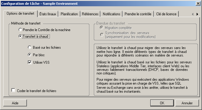 Pour spécifier les options de transfert pour une tâche de conversion :