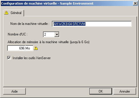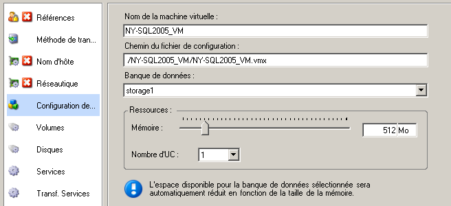 En mode Assistant, Portability Suite vous invite uniquement à définir les options de configuration des machines virtuelles de base. Pour la configuration des options avancées des machines virtuelles, telles que celles liées aux réserves de ressources et à la planification de l'UC, passez en mode Avancé.