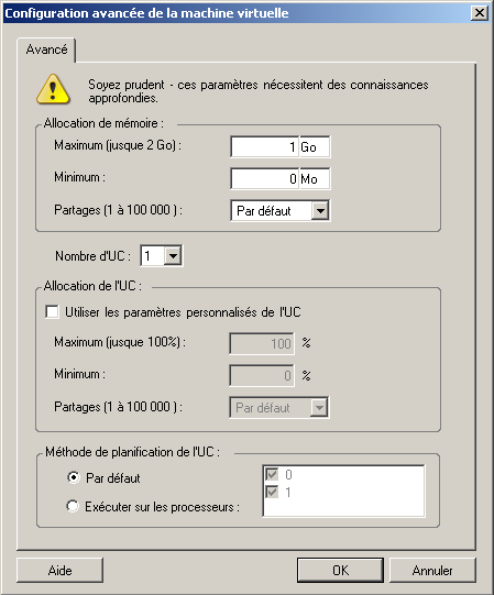 Les options de configuration suivantes sont spécifiques à VMware ESX 3 et 3.5. Pour accéder aux paramètres de contrôle des réserves de ressources, du nombre d'UC et de la méthode de planification de l'UC, cliquez sur .