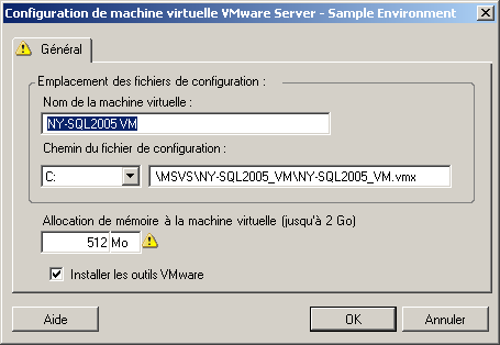 Les options de configuration suivantes sont spécifiques à Microsoft Virtual Server.
