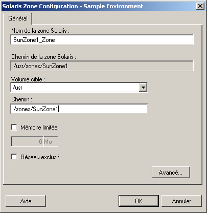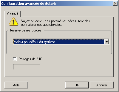 Les options de configuration suivantes sont spécifiques à Solaris. Pour accéder aux paramètres qui contrôlent les partages de l'UC des réserves de ressources, cliquez sur .