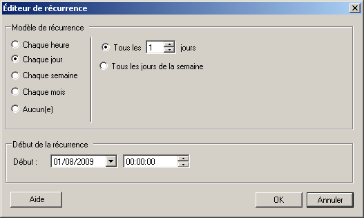 Pour éditer une planification, cliquez sur dans la planification de votre tâche. Les options affichées dans la boîte de dialogue Éditeur de récurrence dépendent de la configuration préalablement sélectionnée pour la tâche.