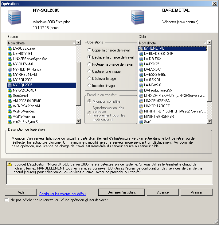 En cas de migration d'une charge de travail d'un fournisseur vers une infrastructure matérielle cible d'un autre fournisseur (par exemple, de HP* vers Dell) ou si votre source est une machine virtuelle, veillez à désactiver les services spécifiques au fournisseur ou à la machine virtuelle pendant le transfert. Il peut, par exemple, s'agir des services HP Insight et des outils VMware. Reportez-vous à la section Gestion des applications et des services du système d'exploitation.