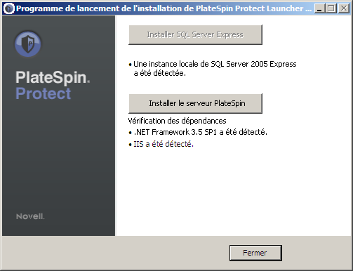 Si vous prévoyez d'utiliser le logiciel Microsoft SQL Server 2005 Express Edition distribué avec PlateSpin Protect, installez-le d'abord. Si vous comptez utiliser une base de données SQL Server 2005 existante, ignorez l'installation de la base de données et passez directement à l'installation du serveur PlateSpin Protect.