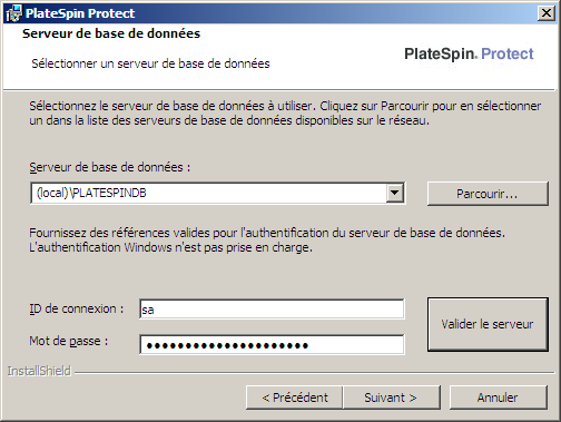 Si vous utilisez un serveur de base de données compris dans votre distribution de logiciels PlateSpin Protect installée localement (option par défaut), gardez la sélection par défaut (local)\PLATESPINDB dans la liste déroulante et les références sa par défaut. Si, par la suite, vous déplacez votre instance de base de données PlateSpin Protect ou modifiez votre mot de passe SQL Server, vous devez redéfinir les paramètres de connexion de la base de données PlateSpin Protect.