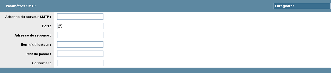 Spécifiez une de serveur SMTP, un facultatif (le port par défaut porte le numéro 25) et une pour la réception des notifications d'événements et de progression par message électronique.