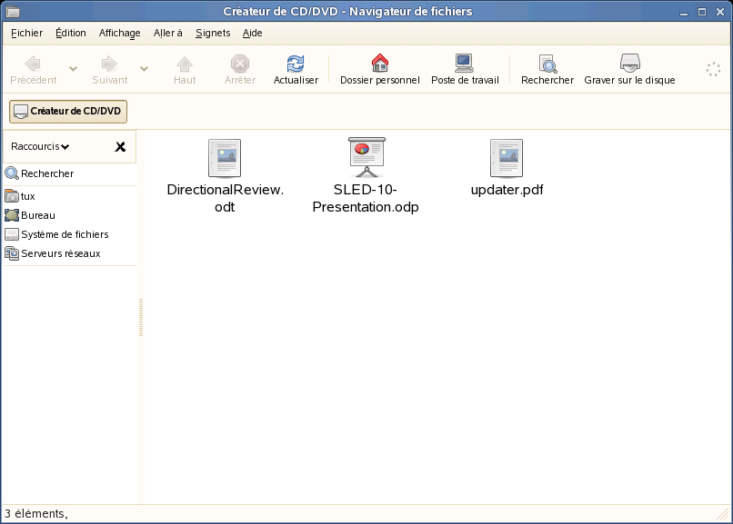 Copiez les fichiers que vous voulez placer sur le CD ou le DVD dans la fenêtre de Nautilus.