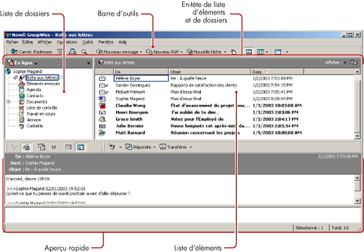 Dans GroupWise, la zone de travail principale est appelée « fenêtre principale ». À partir de la fenêtre principale, vous pouvez lire vos messages, planifier vos rendez-vous, afficher votre agenda, gérer vos contacts, changer le mode d'exécution de GroupWise, ouvrir des dossiers ou des documents, etc.