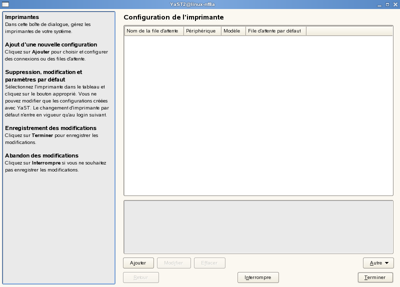Utilisez YaST pour configurer des imprimantes. Démarrez YaST, puis cliquez sur pour ouvrir la fenêtre de configuration d'imprimante principale. Selon votre environnement réseau ou le modèle de votre imprimante locale, il se peut que YaST soit en mesure de la configurer automatiquement. En cas d'échec de la détection automatique des périphériques d'impression, cliquez sur dans la boîte de dialogue pour démarrer le processus de configuration manuelle. Suivez les instructions de l'aide en ligne de YaST. Si vous avez un doute quant à l'option à choisir ou aux informations à entrer, contactez votre administrateur système.