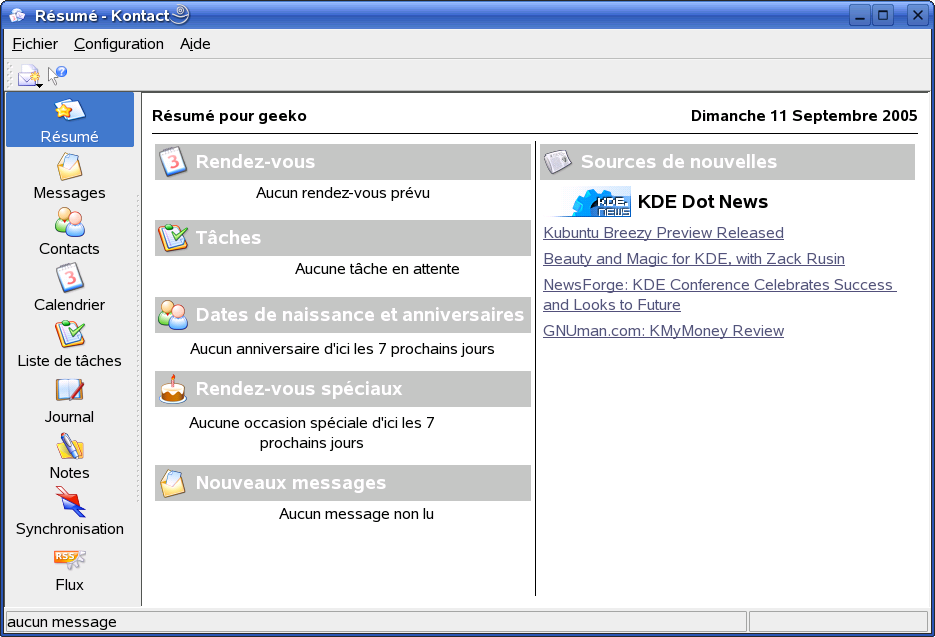 Pour lancer Kontact, appuyez sur Alt+F2, puis saisissez kontact. Pour accéder à l'un des composants, cliquez sur l'icône correspondante dans le panneau latéral gauche.