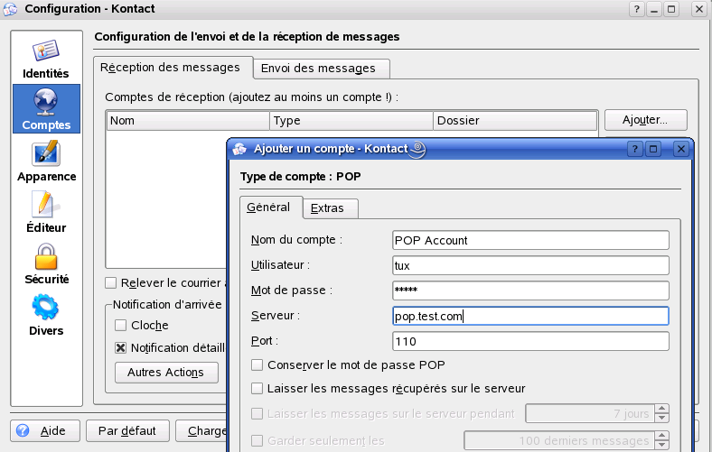 Dans la boîte de dialogue de configuration, cliquez sur . Dans cette boîte de dialogue, vous pouvez configurer les paramètres du courrier sortant et entrant.