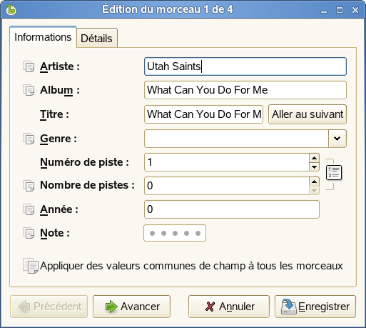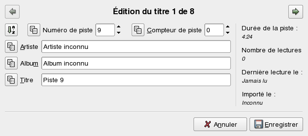 Si vous voulez définir tous les champs d'un groupe avec la même valeur, sélectionnez plusieurs morceaux d'une liste d'écoute puis cliquez sur . Effectuez les changements voulus, puis cliquez sur . Vous pouvez aussi utiliser les boutons et pour faire défiler les morceaux sélectionnés.