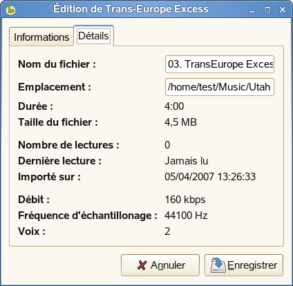 Cliquez sur l'onglet pour afficher des informations détaillées sur le morceau sélectionné, notamment quand le morceau a-t-il été écouté dernièrement, quand a-t-il été importé, sa durée et le nombre de fois qu'il a été écouté.