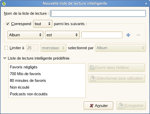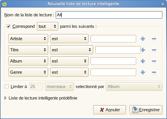 Cliquez sur les symboles plus ou moins pour ajouter ou retirer des critères. Pour utiliser une liste de morceaux déjà définie, cliquez sur , puis sélectionnez la liste voulue.