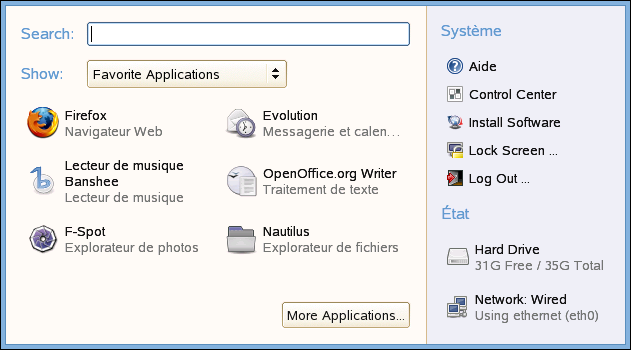 À l'instar du menu Démarrer de Windows, tous les programmes installés sur votre système sont accessibles par le biais du menu principal. Pour ouvrir le menu, cliquez sur dans le coin gauche du tableau de bord. La structure de menu par fonction facilite la recherche de l'application la mieux adaptée à vos besoins, même si vous n'en connaissez pas le nom. Pour plus d'informations sur le menu principal, reportez-vous à la Section 1.4, Utilisation du menu principal.