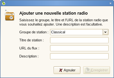 Entrez les détails du flux dans la boîte de dialogue Ajouter une nouvelle station de radio, puis cliquez sur .