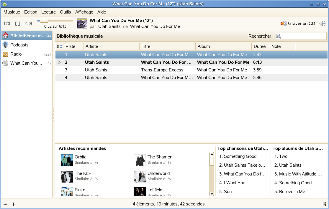 Helix Banshee intègre également un lecteur de CD. Lorsque vous insérez un CD de musique, son titre apparaît dans le volet de gauche. Sélectionnez le titre et cliquez sur le bouton de lecture pour lire tout le CD.