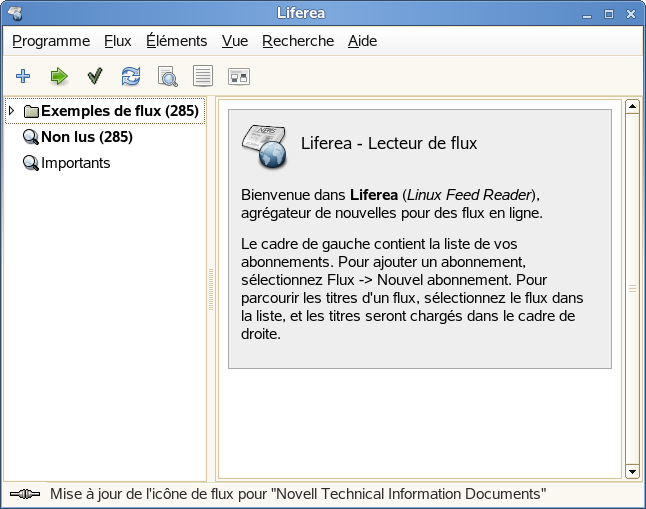 L'interface Liferea est par défaut divisée en deux sections : la liste de flux et la liste d'éléments. La liste de flux est sur la gauche. Elle contient la liste de vos abonnements. Lorsque vous cliquez sur un abonnement, les titres correspondants s'affichent dans la liste des éléments sur la droite. Lorsque vous cliquez sur un titre, le contenu de ce flux apparaît dans le panneau d'affichage sous la liste des éléments.