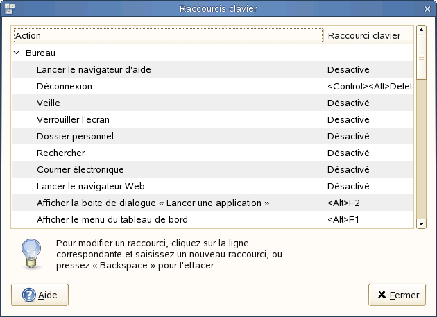 Pour changer les raccourcis clavier d'une action, sélectionnez l'action et appuyez sur les touches que vous voulez lui associer. Pour désactiver les raccourcis clavier d'une action, cliquez sur le raccourci de l'action et appuyez sur Retour arrière.