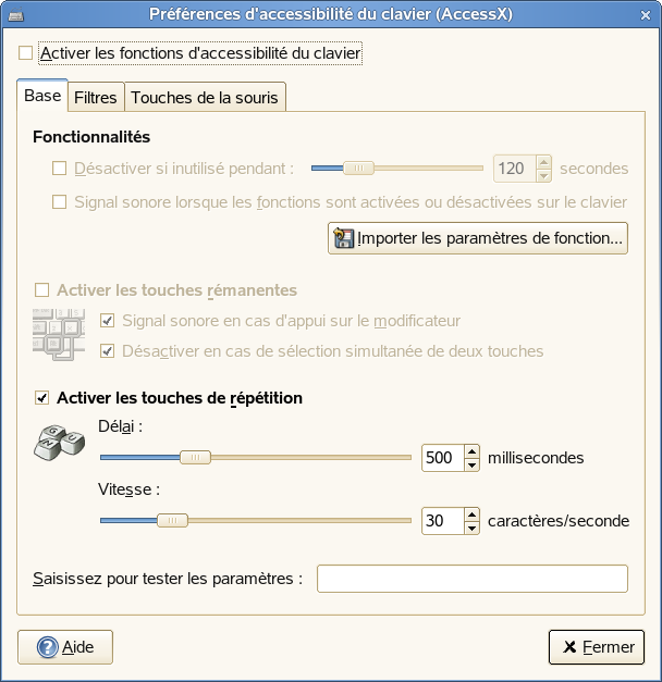 GNOME offre des paramètres du clavier conçus pour aider les utilisateurs handicapés moteur à utiliser le bureau GNOME. Les paramètres disponibles sont les suivants :