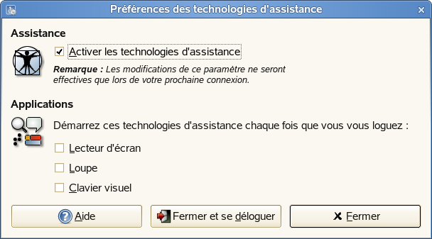 Le paquetage gok doit être installé pour obtenir l'assistance du clavier visuel et les paquetages gnopernicus et gnome-mag doivent être installés pour obtenir les fonctions de lecteur d'écran et de loupe.