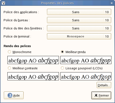 La partie supérieure de la boîte de dialogue affiche les polices sélectionnées pour les applications, les , le bureau, les titres de fenêtres et la police de largeur fixe pour les terminaux. Cliquez sur l'un des boutons afin d'ouvrir une boîte de dialogue de sélection dans laquelle vous définissez la famille de la police, le style et la taille.