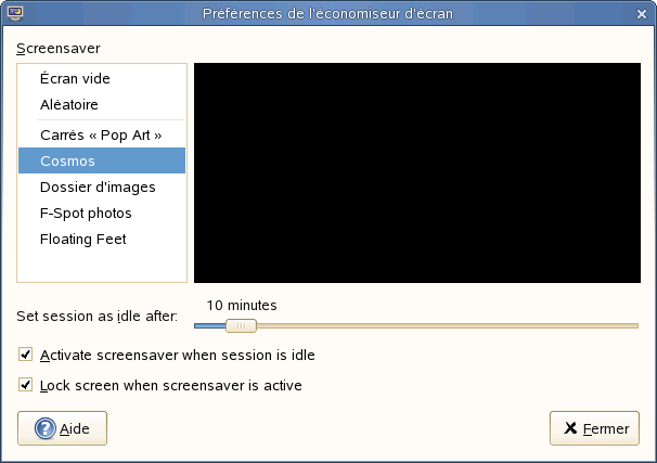 Sélectionnez un écran de veille dans la liste pour le choisir. L'écran de veille actuellement sélectionné apparaît dans la petite fenêtre d'aperçu. Indiquez le temps pendant lequel l'écran doit être inactif avant que l'écran de veille ne soit activé, et si l'écran est verrouillé lorsque l'écran de veille est activé.