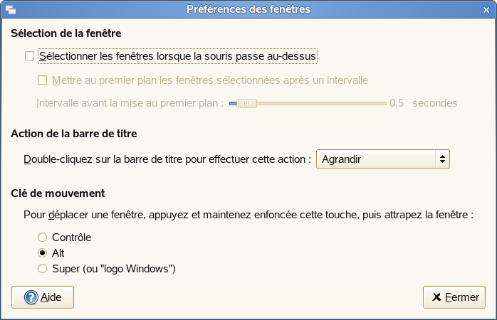 Utilisez l'outil Préférences des fenêtres pour personnaliser le comportement des fenêtres sur le bureau. Vous pouvez déterminer comment la fenêtre réagit lorsqu'elle est en contact avec le pointeur de la souris ou lorsque vous double-cliquez sur sa barre de titre, et définir la touche à maintenir enfoncée pour déplacer une fenêtre d'application.