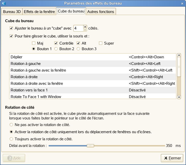 Utilisez les options de cet onglet pour spécifier le nombre de faces du cube du bureau, la combinaison de touche et de bouton de la souris à utiliser pour déplacer le cube, et pour configurer la rotation du cube.