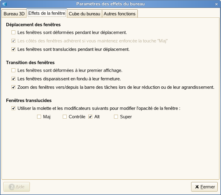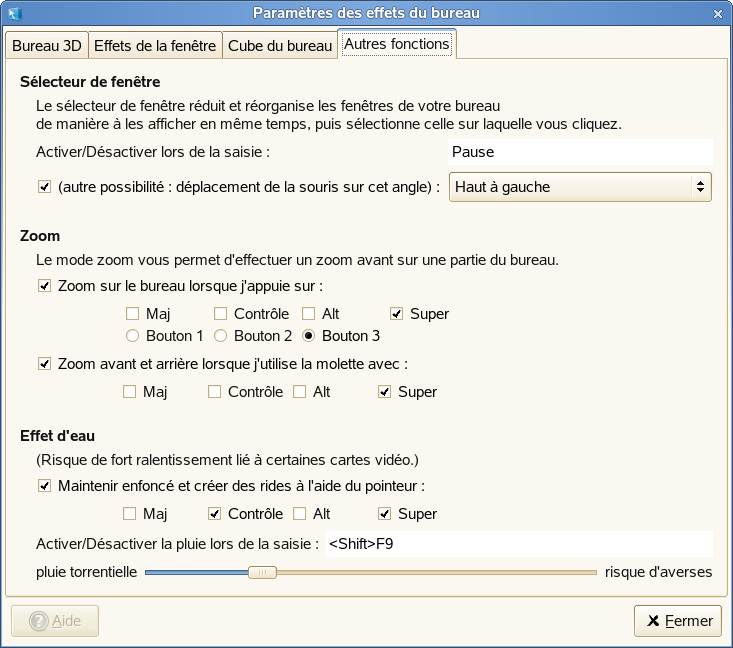 Utilisez l'outil Paramètres des effets du bureau pour activer ou désactiver des effets du bureau particuliers, ou pour changer les touches ou les actions de la souris utilisées pour contrôler ces effets.