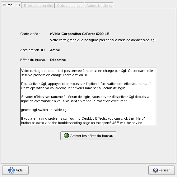 L'outil Effets du bureau analyse votre système pour déterminer s'il est compatible avec Xgl. S'il détecte quelque chose d'incorrect, il vous informe des actions possibles. Par exemple, il peut vous conseiller de changer la résolution de l'écran ou la profondeur de couleurs, ou encore d'activer l'accélération 3D. Suivez les indications à l'écran afin de configurer votre système pour Xgl.