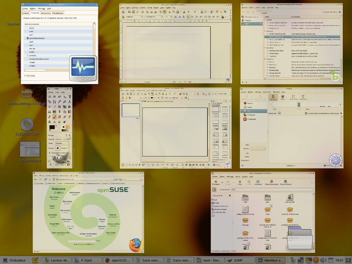 Xgl est une architecture Xserver qui permet de transformer votre bureau en cube 3D pivotant, à organiser les fenêtres en mosaïque afin qu'elles ne se chevauchent pas, et à permuter les tâches tout en visualisant les miniatures dynamiques. Vous pouvez activer les fenêtres translucides ou transparentes, faire un zoom avant ou arrière dans l'écran du bureau, et utiliser d'autres effets associés aux fenêtres comme les ombres, le fondu ou des transformations. Vous pouvez également configurer l'accrochage des fenêtres à d'autres fenêtres ou à des bordures d'écran lors de leur déplacement.